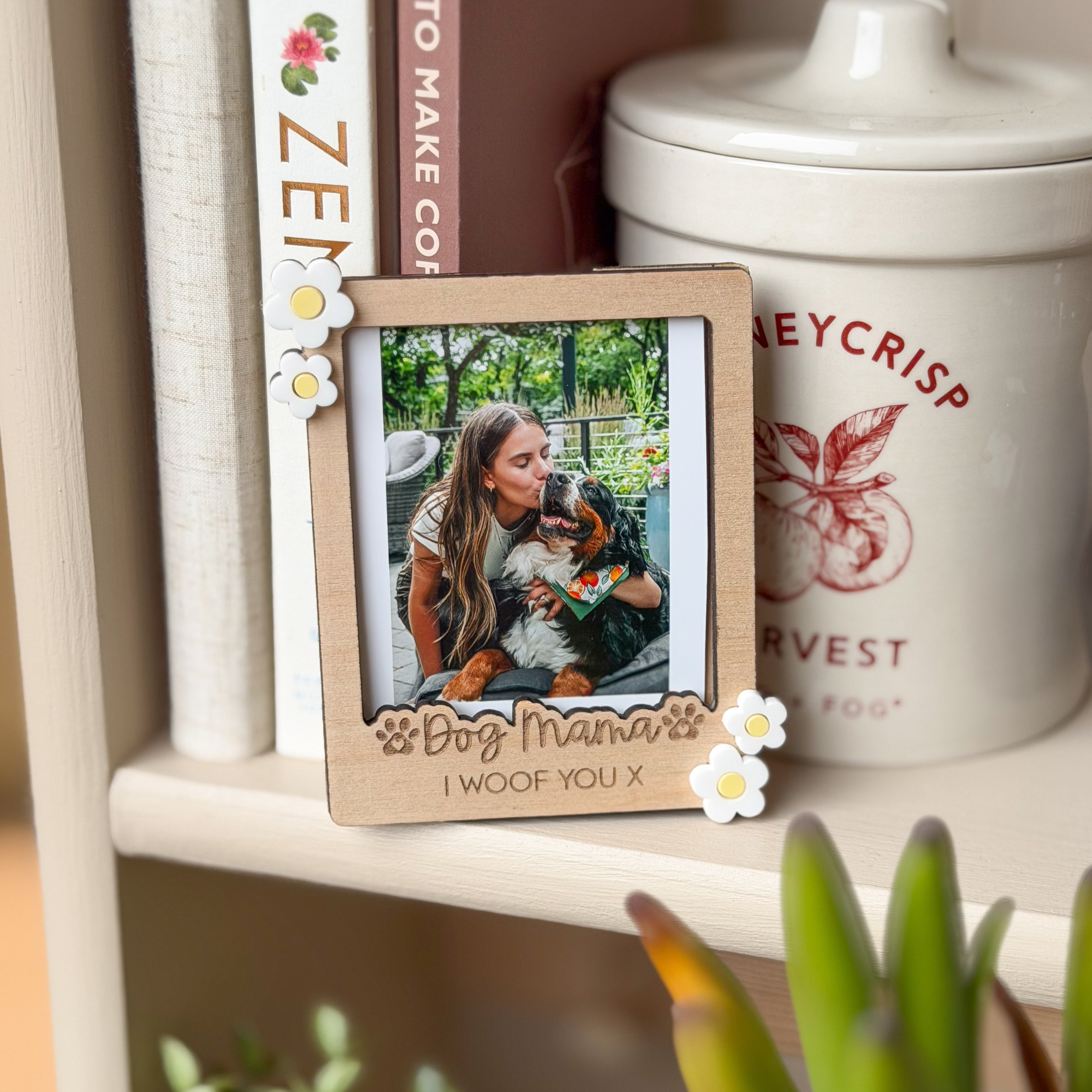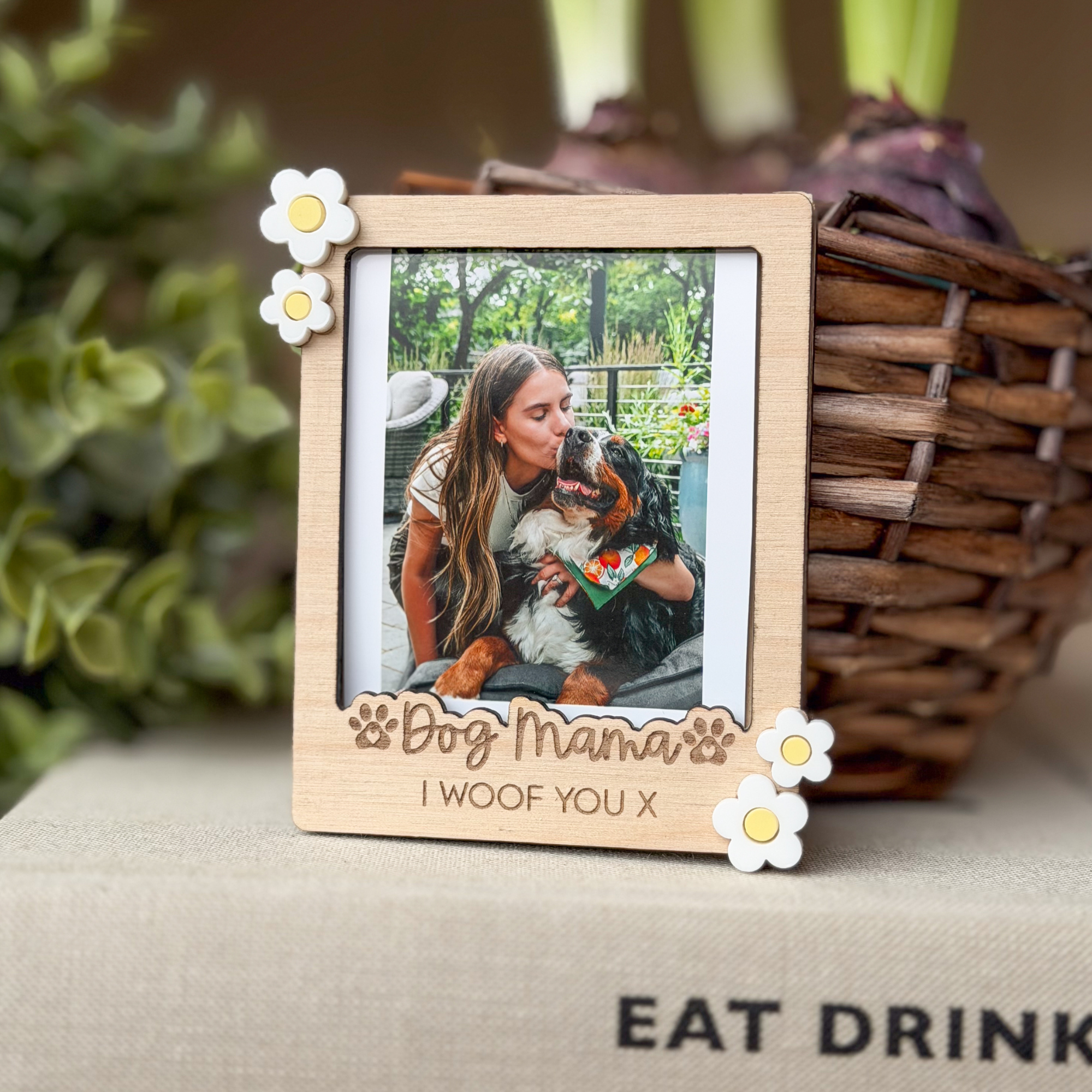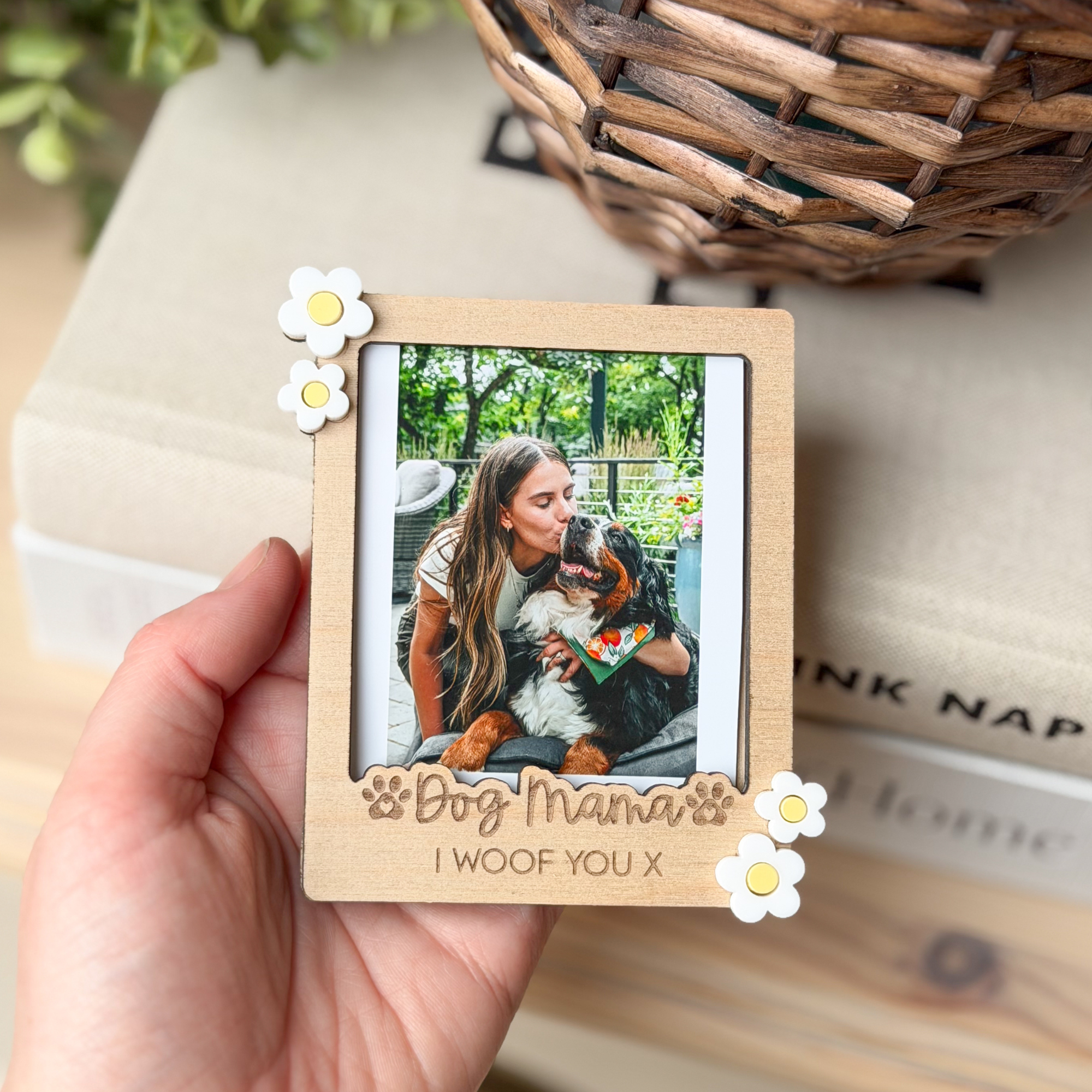 Designed in a trendy polaroid style, this wooden custom photo frame features delicate acrylic flower accents and a deeply engraved “Dog Mama” title complete with cute paw prints. It is a truly sentimental gift for any pet parent and a beautiful way to celebrate the bond with your four-legged best friend.