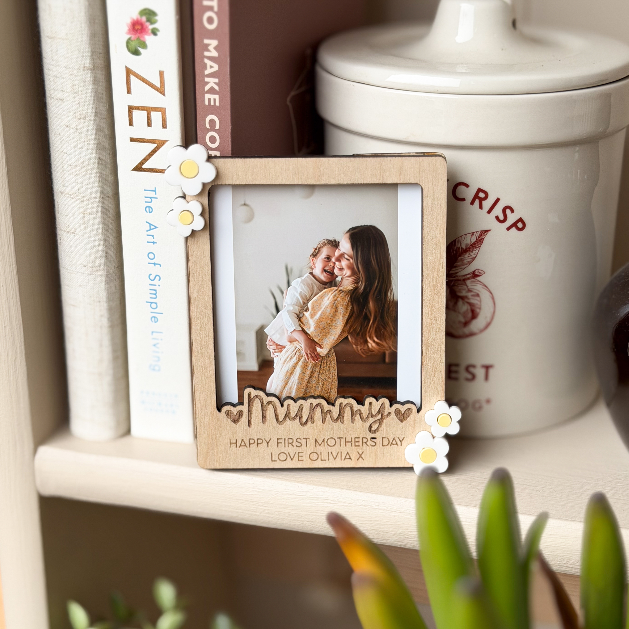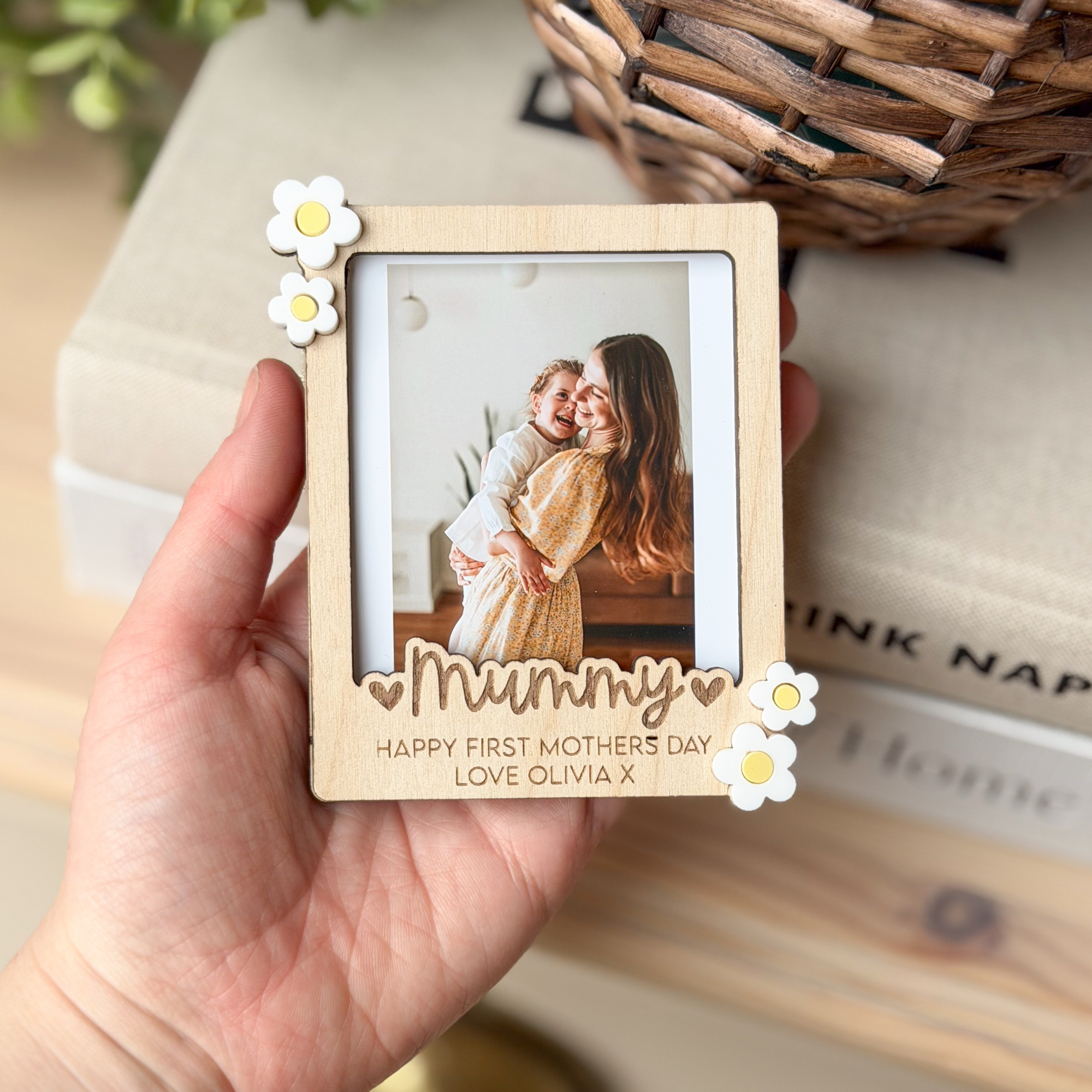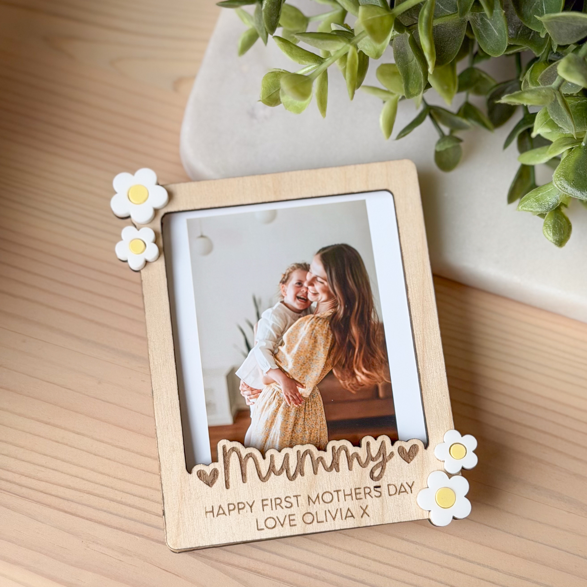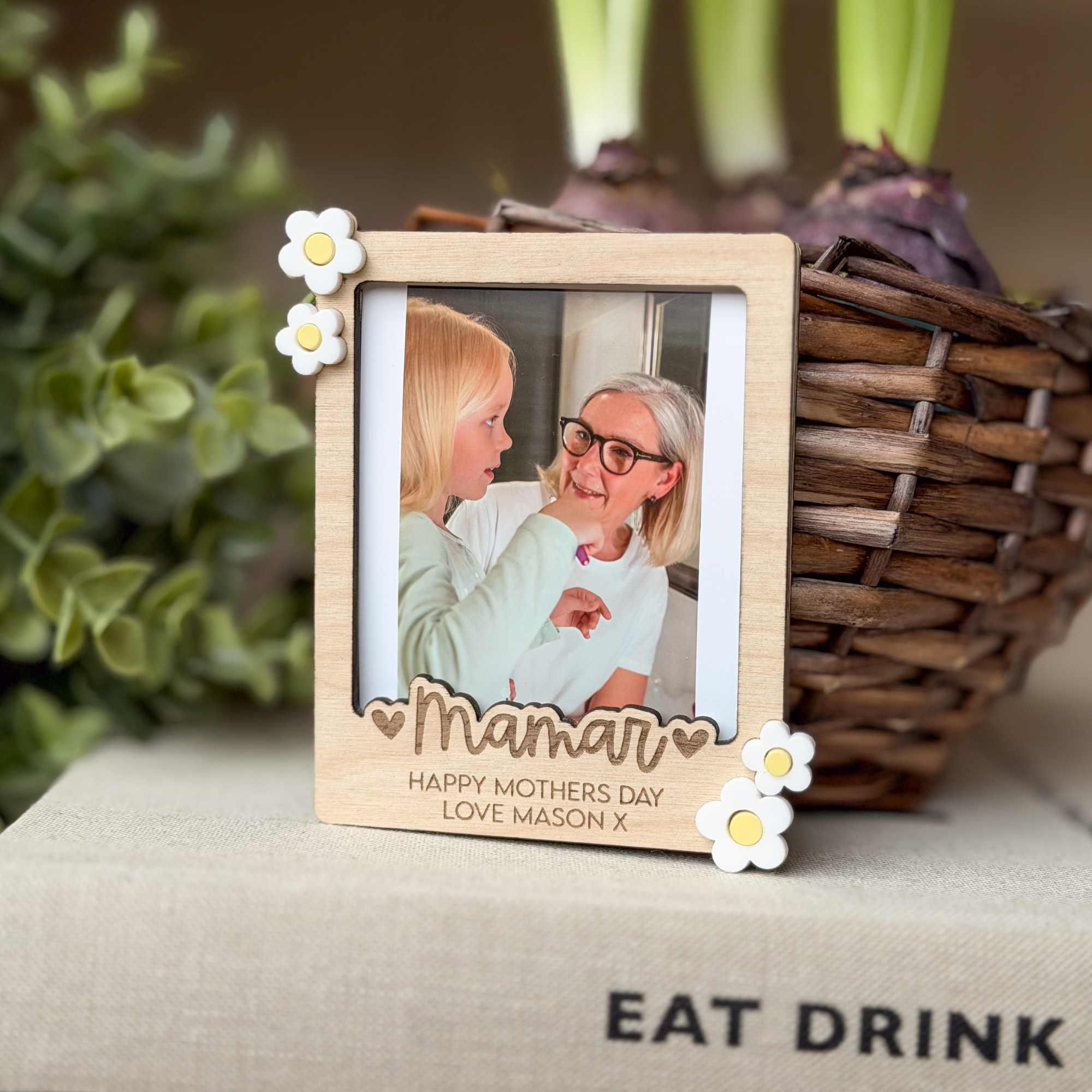 Designed in a trendy, vintage polaroid style, this wooden custom photo frame features delicate white 3D acrylic flower accents and a deeply engraved title flanked by sweet hearts. It is a truly sentimental gift and a beautiful way to celebrate Mum, Nanna, or Grandma this year.